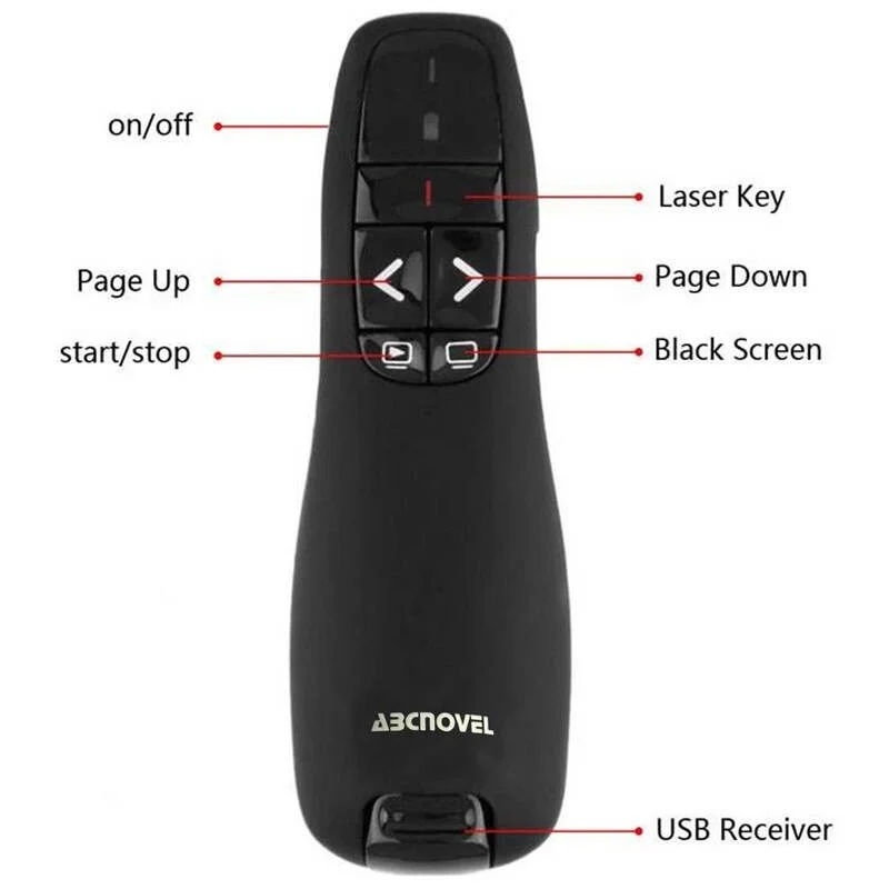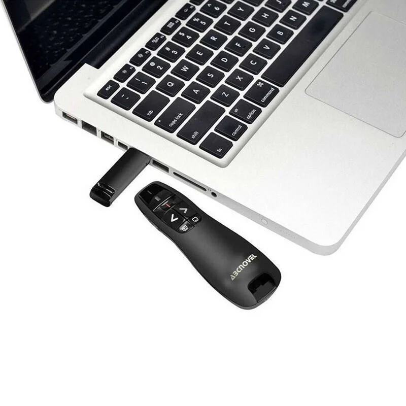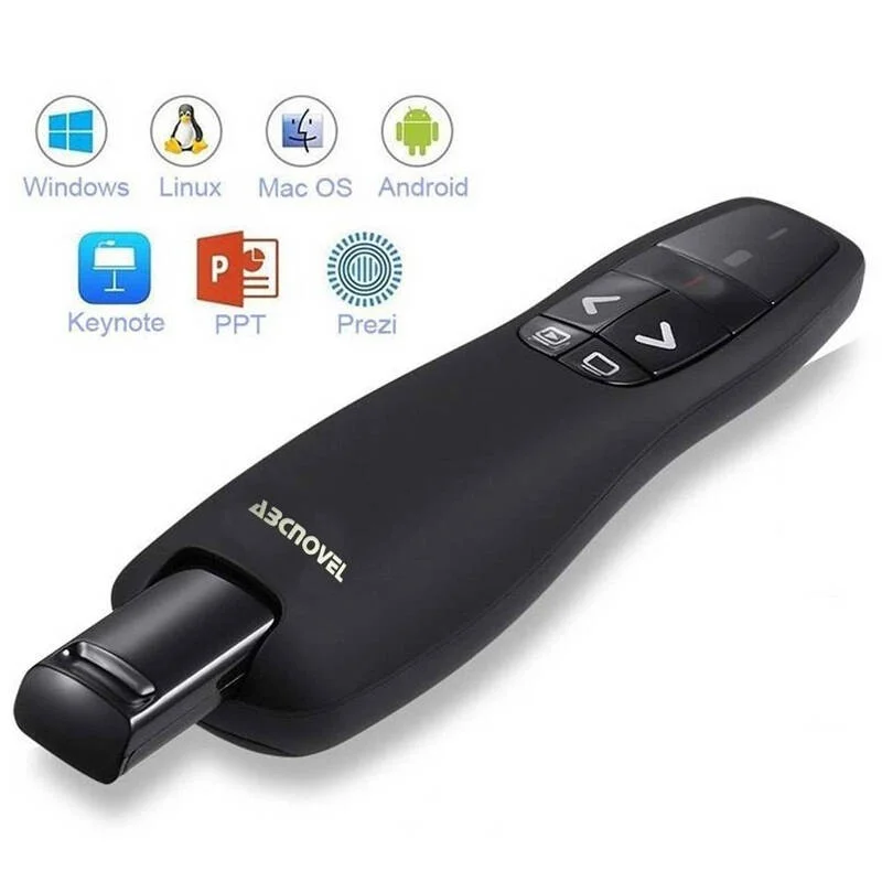 قابلیت قرارگیری دانگل داخل پرزنتر به منظور جلوگیری از گم شدن آنمجهز به لیزر با نوردهی قرمز رنگ، دارای نشانگر LED و نشانگر میزان شارژتامین انرژی توسط دو عدد باتری نیم قلمی AAA، همراه با یک عدد کیف ضد ضربهاتصال بی سیم توسط دانگل USB با فرکانس بی سیم ۲٫۴ گیگاهرتز تا برد ۱۰ متربدنه ساخته شده از جنس پلاستیک ABS مقاوم در برابر ضربه و فشارهای احتمالیسازگار با انواع گوشی موبایل با سیستم عامل اندروید و لپ تاپ و کامپیوتر با سیستم عامل ویندوز و مکبا قابلیت کنترل برنامه های آفیس، مناسب برای ارائه ی مقاله، برگزاری جلسات دانشگاهی، کنفرانس و …دارای کلیدهای فیزیکی متنوع جهت روشن و خاموش کردن، تغییر اسلاید ها (بالا-پایین)، نمایش اسلاید (Slide Show) و …